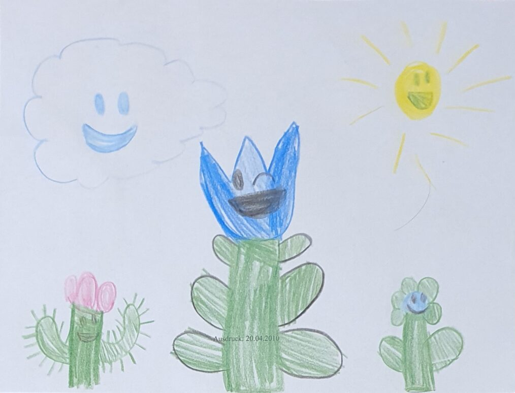 Als ich unlängst meine Tochter vom Kindergarten abholte, war sie mit anderen Kindern beim Zeichnen. Ich wartete eine ganze Weile, bis eine lachende Sonne und Wolken mit Gesichtern ihre Vollendung fanden. (siehe Bild) Die Atmosphäre war inspirierend. Ich saß auf einem der kleinen Stühle und zeichnete ebenfalls.